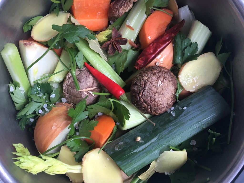 Veel te vaak kom ik een recept tegen waarbij een bouillonblokje wordt gebruikt. Gemak dient de mens natuurlijk, maar als je een beetje tijd over hebt draai je met hetzelfde gemak zelf een geurige bouillon in elkaar. Deze Aziatische groentebouillon is (uiteraard) vegetarisch en een mooie basis voor bijvoorbeeld noodle soepen (zoals de Vietnamese Phở).