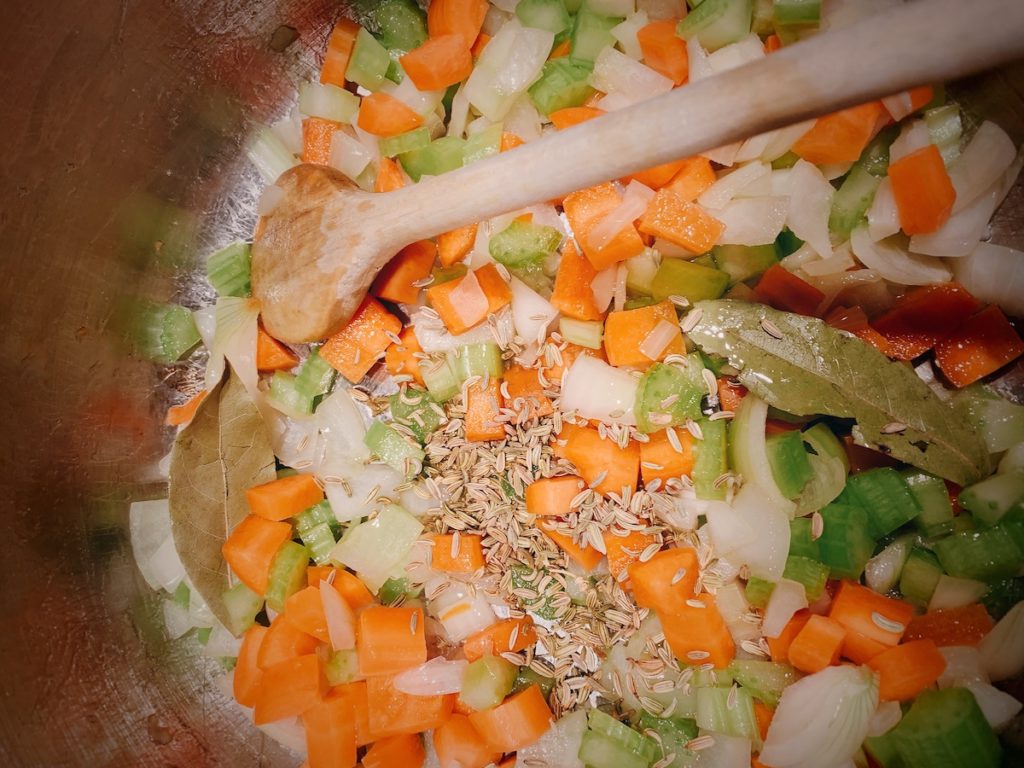 Doe een flinke scheut olijfolie in een soeppan en voeg daarbij op halfhoog vuur de wortel, ui, bleekselderij, samen met de laurierbladeren, tijm en venkelzaad. Schep om en zet zacht; laat 5 minuten staan. Doe de pepervlokken (naar smaak!) en knoflook erbij, meng met de groenten.