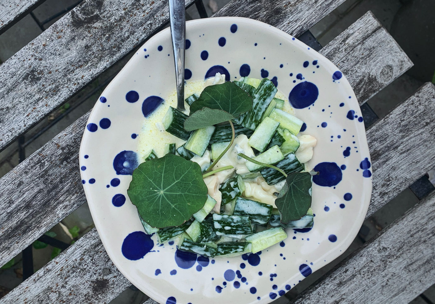 Snijd de komkommer in de lengte door, verwijder de zaadlijsten (met een lepel) en verdeel vervolgens in stukken van 1 bij 2 cm. Strooi zout erover en laat minstens 30 minuten staan. Gooi vervolgens het vocht weg. Meng een paar eetlepels geitenyoghurt en zachte blauwe kaas door elkaar (er mogen brokken kaas in blijven, juist lekker), voeg wat zout en zwarte peper uit de molen toe. Meng door de komkommer. Ook heb ik er nog een paar blaadjes Oost-Indische kers erop gelegd (uit eigen tuin).