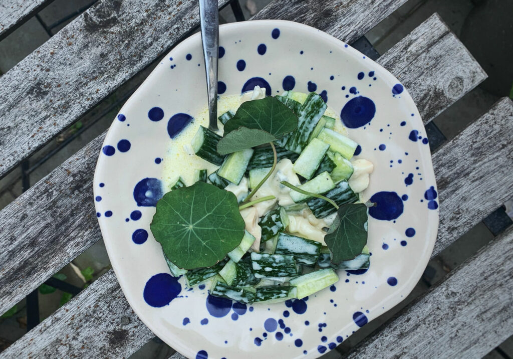Snijd de komkommer in de lengte door, verwijder de zaadlijsten (met een lepel) en verdeel vervolgens in stukken van 1 bij 2 cm. Strooi zout erover en laat minstens 30 minuten staan. Gooi vervolgens het vocht weg. Meng een paar eetlepels geitenyoghurt en zachte blauwe kaas door elkaar (er mogen brokken kaas in blijven, juist lekker), voeg wat zout en zwarte peper uit de molen toe. Meng door de komkommer. Ook heb ik er nog een paar blaadjes Oost-Indische kers erop gelegd (uit eigen tuin).