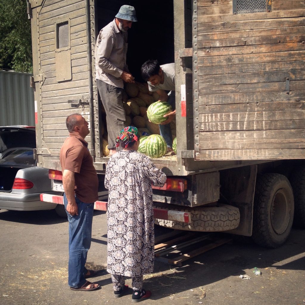 Onze chauf moet even wat watermeloenen (niet te missen in Tajikistan, overal zie je ze) afdroppen bij z’n familie in Vanj, dus we maken een kleine detour. Inclusief lunch. En wat voor één. We worden als koningen onthaald, drinken thee uit het luxe servies en mogen vooral niet te weinig eten. En eigenlijk moeten we ook blijven slapen.