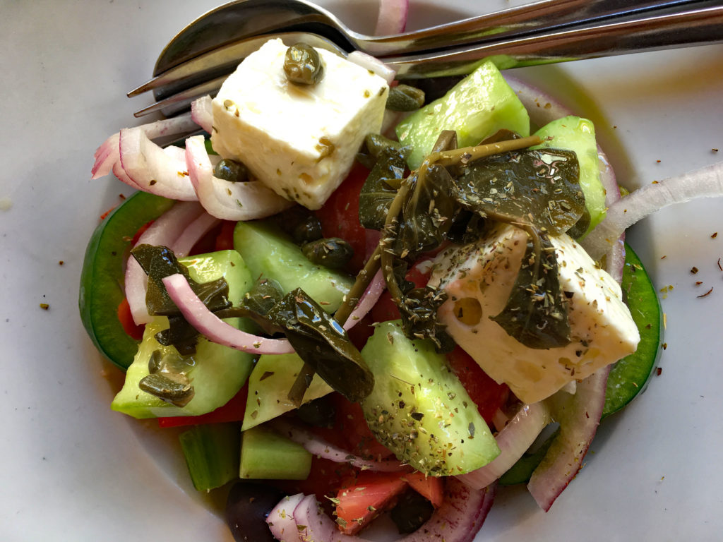 Waar ter wereld kun je elke dag schaamteloos lunchen met een Griekse salade. En dan niet zo’n lullige met maar een paar blokjes laffe nep-feta, maar met grote brokken echte feta. En een flinke scheut lekkere olijfolie.